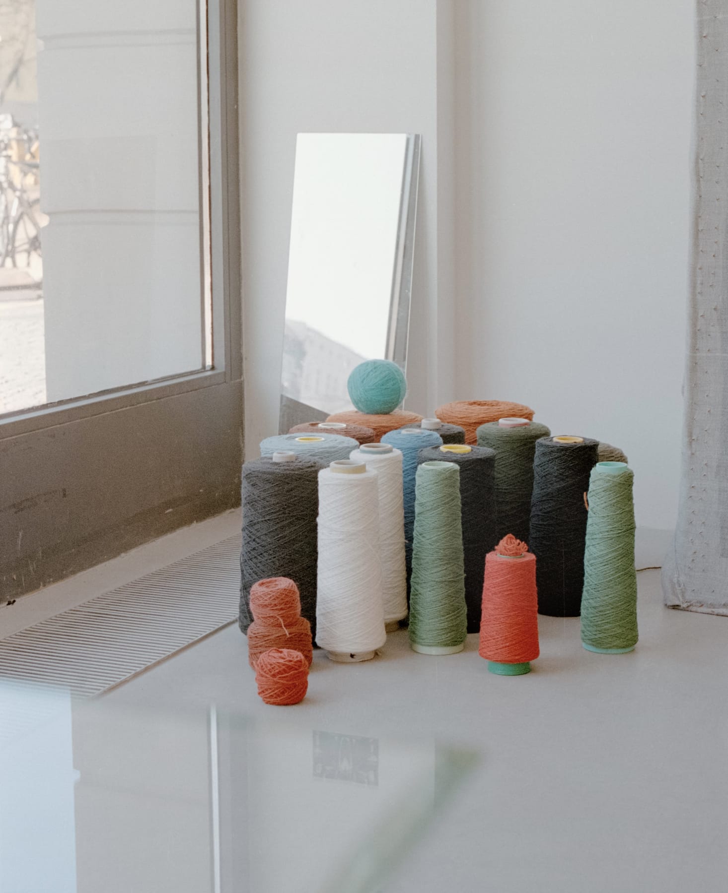 Spools of yarn sit near the